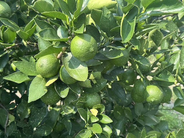 | 令和7年産ライムの様子 風味を楽しんでいただくために青い果実のまま収穫しています カクテルや料理の付合わせに使ってください 紀の川市で育まれた風味豊かなライムをお楽しみください |