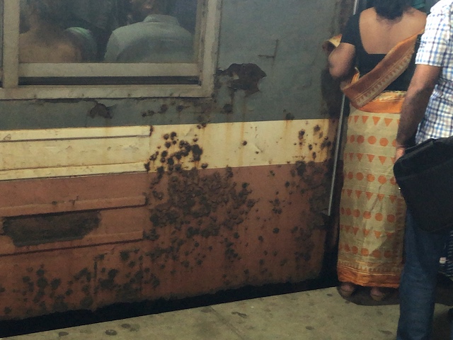 三等車の外観。ひどいサビサビ状態。それでも十分活躍しています。